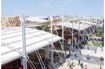 At the WORLD EXPO Milano in 2015, the roofing of the main walkways had been made of the membrane VALMEX® FR 1200 MEHATOP® F Type III by Mehler Texnologies. (Photo: TAIYO EUROPE)